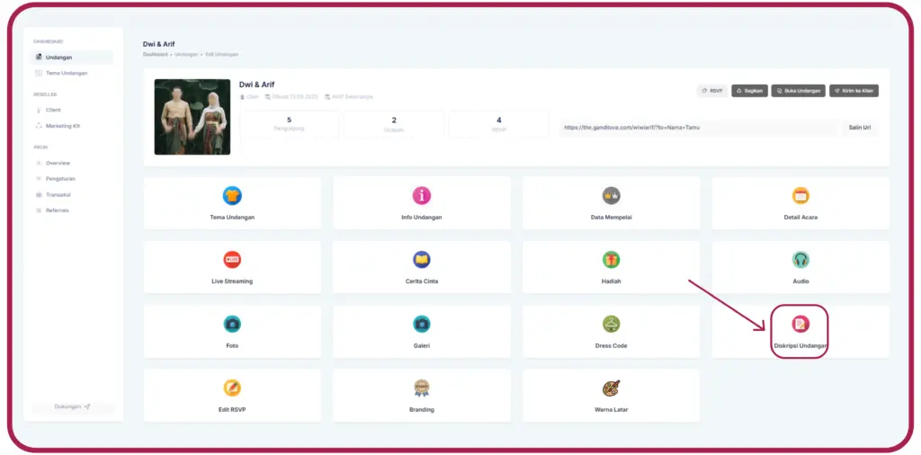 Ketika kamu ingin mengubah sebuah diskripsi bawaan yang berada didalam undangan, seperti menganti tulisan atau merubah format ke Bahasa Ingris, silahkan Masuk ke halaman dashboard undangan : Dashboard dan tekan bagian diskripsi undangan