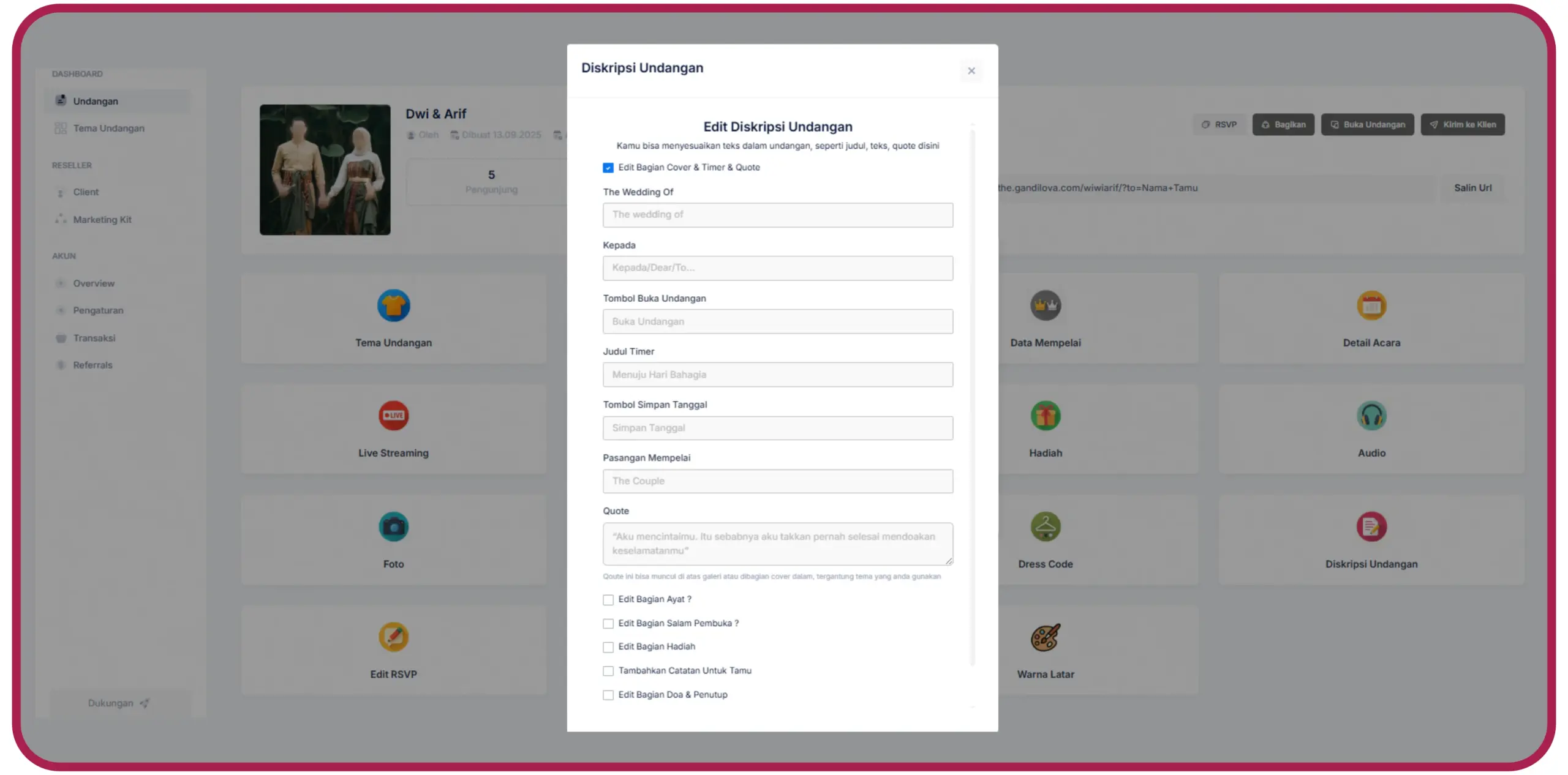 Ketika kamu ingin mengubah sebuah diskripsi bawaan yang berada didalam undangan, seperti menganti tulisan atau merubah format ke Bahasa Ingris, silahkan Masuk ke halaman dashboard undangan : Dashboard dan tekan bagian diskripsi undangan