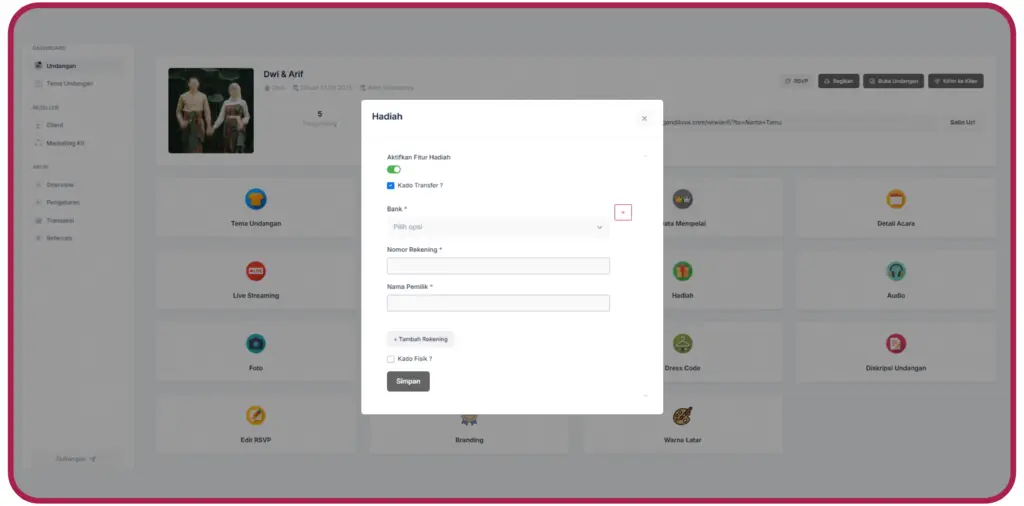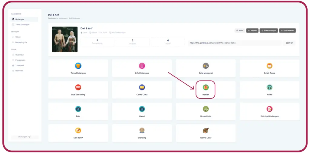 Silahakan Masuk ke halaman dashboard undangan : Dashboard kemudian tekan hadiah